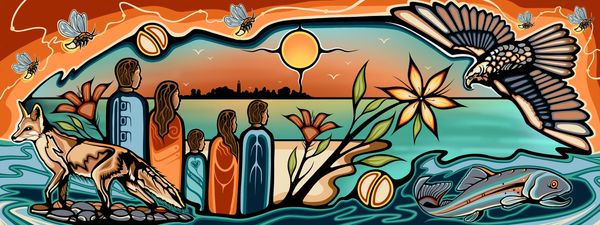 The artwork honours the ancestral territory of the Saugeen Ojibway and invites reflections on our connections and shared responsibility to care for the land, the water and each other.